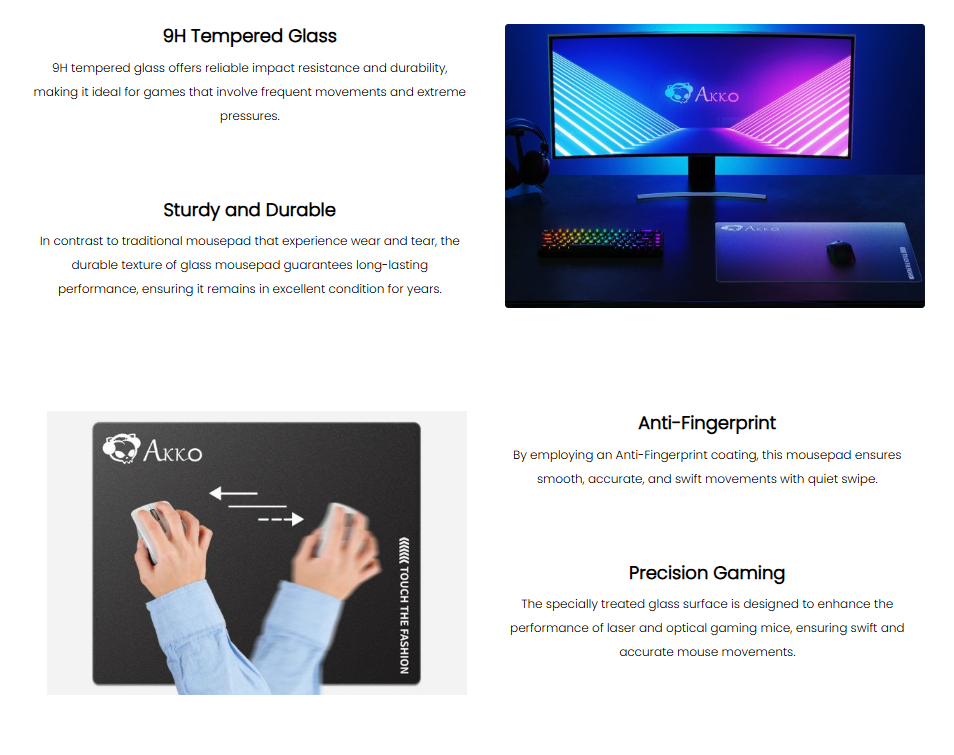 El Akko Glass Gaming Mousepad redefine la experiencia de juego con su superficie de vidrio templado 9H, combinando durabilidad extrema, precisión milimétrica y estética minimalista. Ideal para quienes buscan una base sólida, rápida y de bajo mantenimiento.