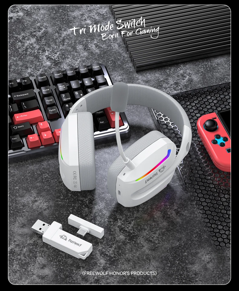 El Freewolf V10 es un headset gaming ultra ligero (208 g) con conectividad tri-mode, sonido envolvente 5.1 optimizado y micrófono desmontable con cancelación de ruido. Diseñado para largas sesiones, combina comodidad, bajo retardo y una estética moderna con iluminación RGB integrada.